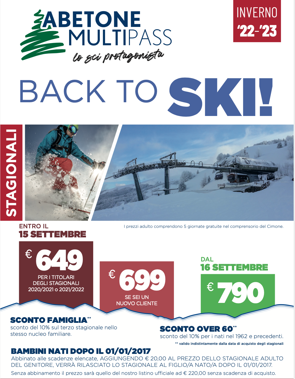 Tutti i biglietti adulti includono 5 giornate di sci nel comprensorio del Cimone.