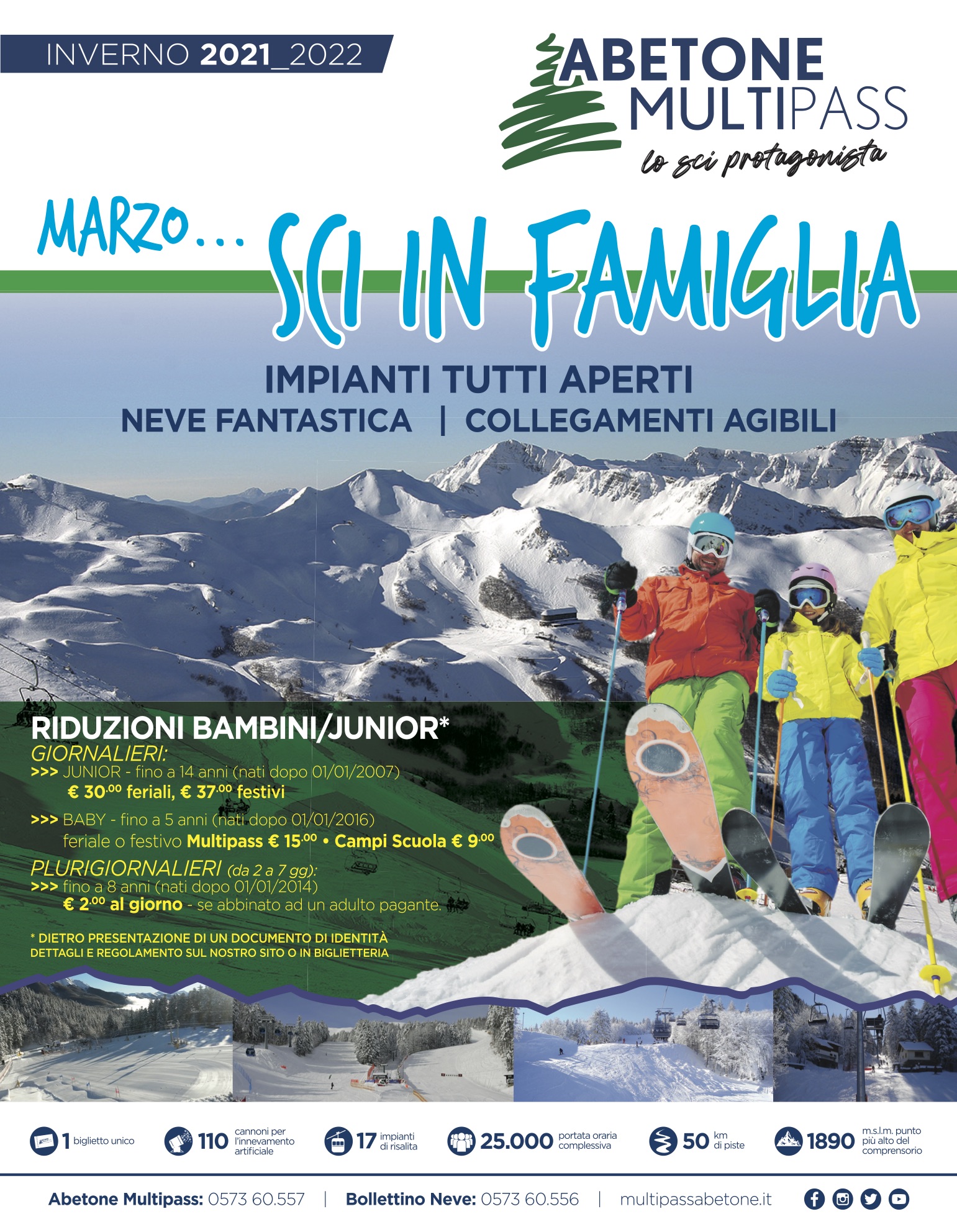 *Fino a 8 anni (nati dopo 1/1/2014) riduzione sui plurigiornalieri, feriali e/o festivi, da 2 gg. a 7 gg. a € 2.00 al giorno, da abbinare obbligatoriamente ad un adulto pagante.